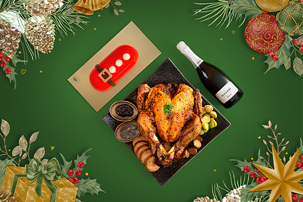 Classic Roast Turkey | D9 Cakery Strawberry Yuzu Cheese Log | A bottle of Prosecco with Chestnut Stuffing, Roasted Baby Potato, Crispy Brussels Sprouts with Bacon. Accompanied with Giblet Gravy, Cranberry Sauce