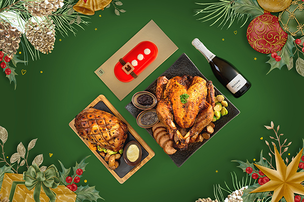 Classic Roast Turkey | Honey and Orange Baked Ham | D9 Cakery Strawberry Yuzu Cheese Log | A bottle of Prosecco with Chestnut Stuffing, Roasted Baby Potato, Crispy Brussels Sprouts with Bacon, Roasted Pumpkin with Feta Cheese. Accompanied with Granny Smith Apple Compote, Giblet Gravy, Cranberry Sauce