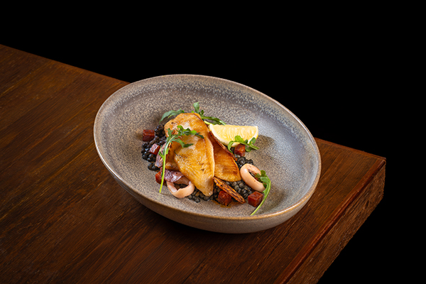 Local-farmed pomfret, grilled squid, squid ink couscous, chorizo