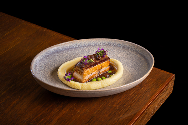 Sous-vide pork belly, maple beer syrup, mashed potato, edamame and rum raisin